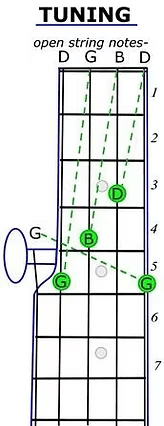The chords here are based on the standard “G” tuning. If you pluck the strings ‘open’ (without pressing on the frets) the notes for the 4 main strings will be D,G,B,D. The 5th (short) string will be tuned to G.