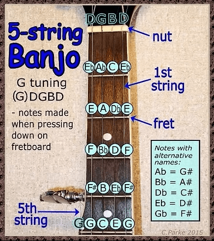 The chord diagrams I have made for banjo also have the notes written in at the top of the strings; don’t worry too much about the actual notes – I’ve added them in for interest and so you can see what notes are in each chord.