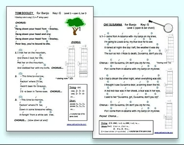 Oh Susanna (G, Bar C & D) – there is a very good instructional video of this song by Tony Thomas on YouTube: Beginner’s Old Time Banjo Lesson – As Easy As 1-2-3 – Volume 1