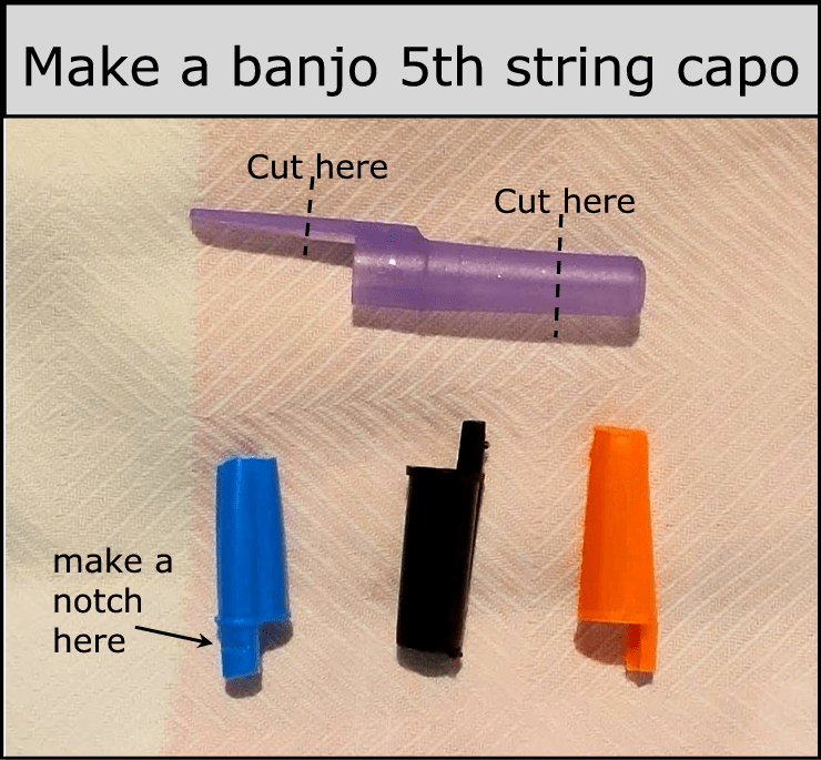 You can buy little 5th string capos, or a sliding one that is fitted to your banjo neck, or you can have ‘railroad spikes’ fitted to your neck to hook the string over… or you can just make an effective, no-cost one by using a plastic ballpoint pen lid, cut down as below.