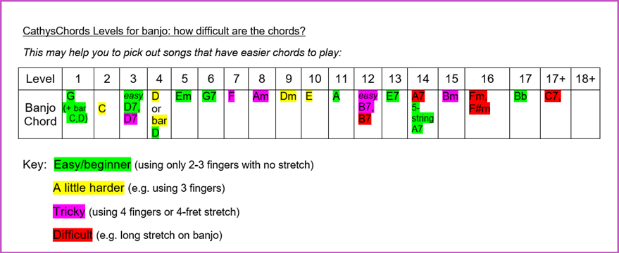 This chart may help you to pick out songs that have easier chords to play (you can use any song that has chords written in, even if it’s supposed to be for guitar/ukulele etc. – if it has chords you can play on your banjo, just play your banjo chord shapes).