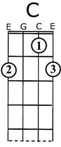 The diagrams give suggested fingering for the chord (so the 1 in the circle is your index finger, 2 is middle finger, 3 is ring finger and 4 is little finger). Form the chord with your left hand and strum slowly across all the strings with your right hand, checking that each strings ring clearly. Adjust your left hand fingers if necessary.