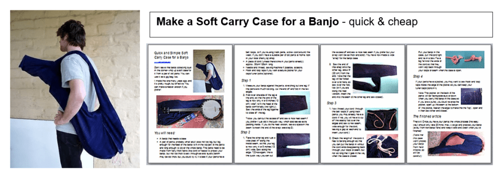 If you have a banjo with no case, you can easily make a soft cover from a large pair of jeans or soft trousers; I made one years ago for my old banjo, and it’s pretty rough but it works. Click on the link in the heading here to open some PDF instructions I put on Instructables.com.